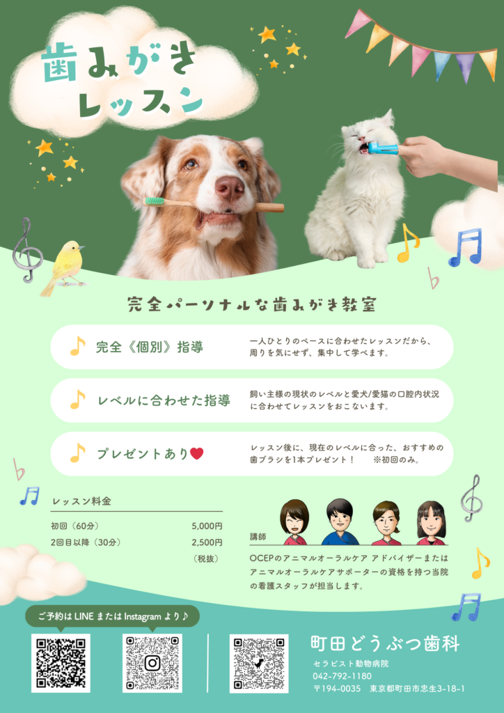 当院スタッフによる 歯みがきレッスンを おこなっております。 OCEP認定 【アニマル オーラルケア アドバイザー】と【アニマル オーラルケア サポーター】による、完全パーソナルなレッスンです。